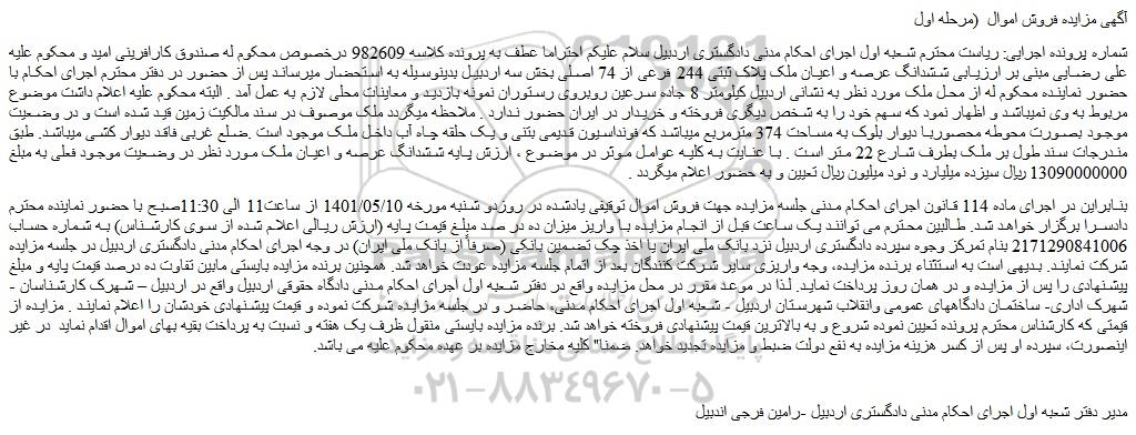 بنابراین در اجرای ماده 114 قانون اجرای احکام مدنی جلسه مزایده جهت فروش اموال توقیفی یادشده در روزدو شنبه مورخه 1401/05/10 از ساعت11 الی 11:30صبح با حضور نماینده محترم دادسرا برگزار خواهد شد. طالبین محترم می توانند یک ساعت قبل از انجام مزایده با واریز میزان ده در صد مبلغ قیمت پایه (ارزش ریالی اعلام شده از سوی کارشناس) به شماره حساب 2171290841006 بنام تمرکز وجوه سپرده دادگستری اردبیل نزد بانک ملی ایران یا اخذ چک تضمین بانکی (صرفاً از بانک ملی ایران) در وجه اجرای احکام مدنی دادگستری اردبیل در جلسه مزایده شرکت نمایند. بدیهی است به استثناء برنده مزایده، وجه واریزی سایر شرکت کنندگان بعد از اتمام جلسه مزایده عودت خواهد شد. همچنین برنده مزایده بایستی مابین تفاوت ده درصد قیمت پایه و مبلغ پیشنهادی را پس از مزایده و در همان روز پرداخت نماید. لذا در موعد مقرر در محل مزایده واقع در دفتر شعبه اول اجرای احکام مدنی دادگاه حقوقی اردبیل واقع در اردبیل – شهرک کارشناسان - شهرک اداری- ساختمان دادگاههای عمومی وانقلاب شهرستان اردبیل - شعبه اول اجرای احکام مدنی، حاضر و در جلسه مزایده شرکت نموده و قیمت پیشنهادی خودشان را اعلام نمایند . مزایده از قیمتی که کارشناس محترم پرونده تعیین نموده شروع و به بالاترین قیمت پیشنهادی فروخته خواهد شد. برنده مزایده بایستی منقول ظرف یک هفته و نسبت به پرداخت بقیه بهای اموال اقدام نماید در غیر اینصورت، سپرده او پس از کسر هزینه مزایده به نفع دولت ضبط و مزایده تجدید خواهد. ضمنا" کلیه مخارج مزایده بر عهده محکوم علیه می باشد.