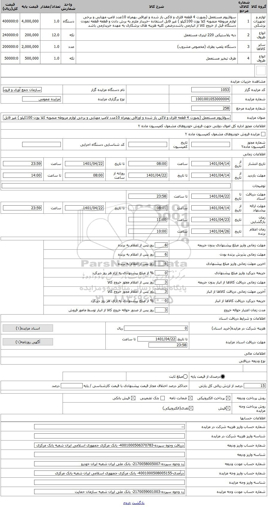 مزایده عمومی مزایده ، سولاریوم مستعمل (بصورت 4 قطعه فلزی و لاکی باز شده و اوراقی بهمراه 10عدد لامپ مهتابی و برخی لوازم مربوطه منصوبه کلا بوزن برگزار میگردد. از کلیه افراد متخصص و شرکتهای واجد شرایط دعوت به عمل میآید تا در این مزایده با کد خبرگزاری پارس نماد : 4702593 شرکت نمایند تاریخ شروع مزایده : 1401/04/14 مهلت شرکت در مزایده: تا پایان روز 1401/04/22