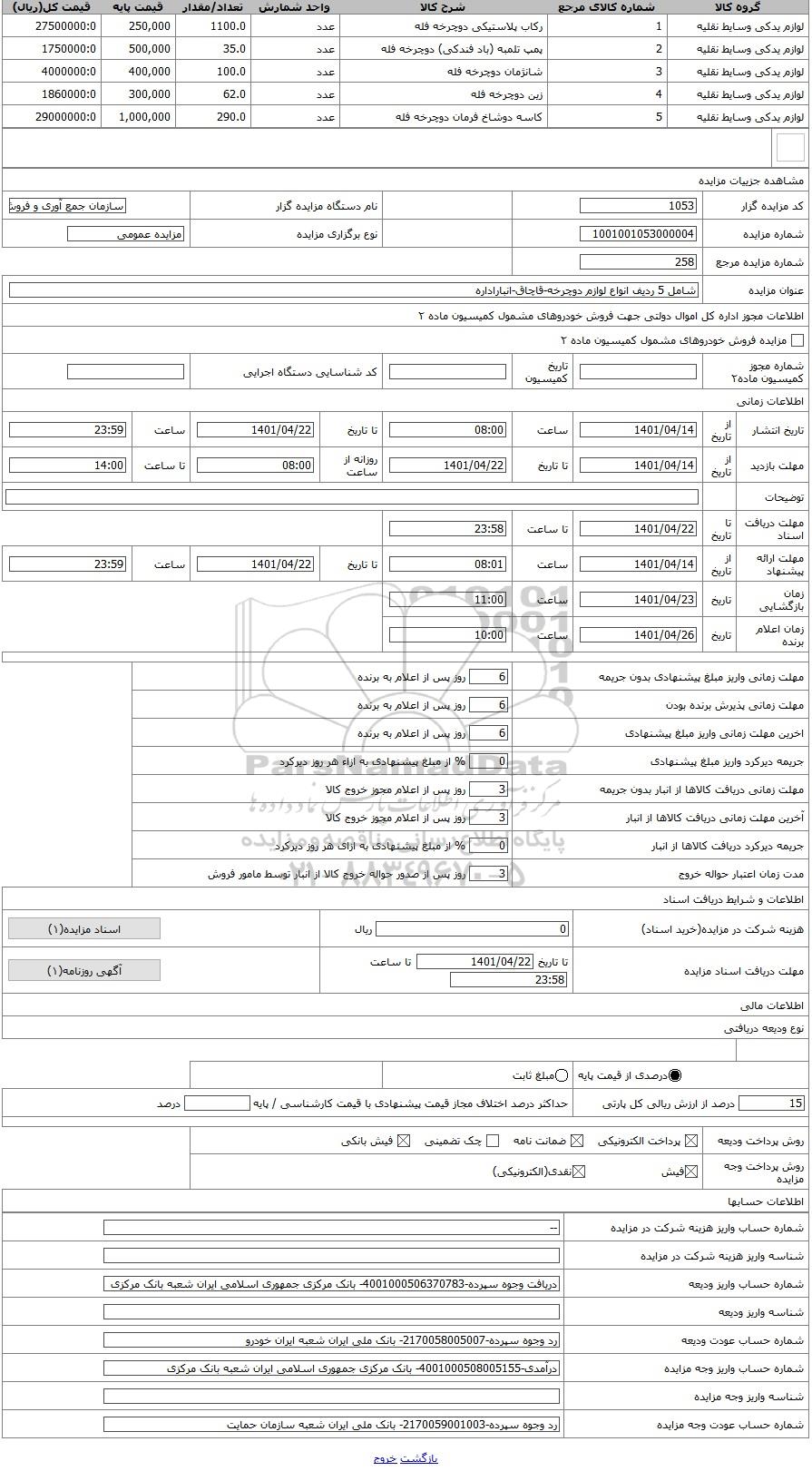 کد مزایده گزار1053نام دستگاه مزایده گزارسازمان جمع آوری و فروش اموال تملیکی