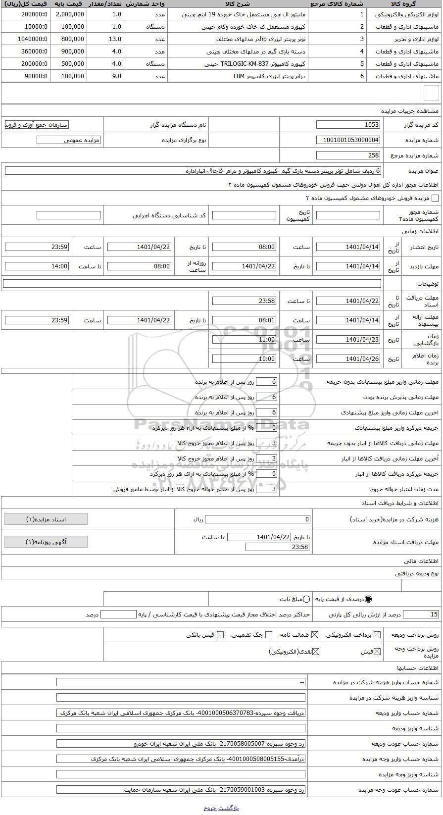 کد مزایده گزار | 1053 | نام دستگاه مزایده گزار | سازمان جمع آوری و فروش اموال تملیکی | |