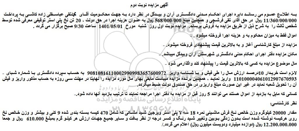 به اطلاع عموم می رساند دایره اجرای احکام مدنی دادگستری آران و بیدگل در نظر دارد به جهت محکومیت آقای محمدتقی عباسقلی زاده کاشی به پرداخت 11/360/000/000 ریال در حق آقای تقی فرشچی و همچنین مبلغ 568/000/000 ریال به عنوان هزینه اجرا در حق دولت ، 20 تن نخ پلی استر توقیفی معرفی شده توسط شخص ثالث را به شرح ذیل از طریق مزایده به فروش برساند. مزایده نوبت اول روز شنبه مورخ 1401/05/01 ساعت 9/30 صبح برگزار می گردد .