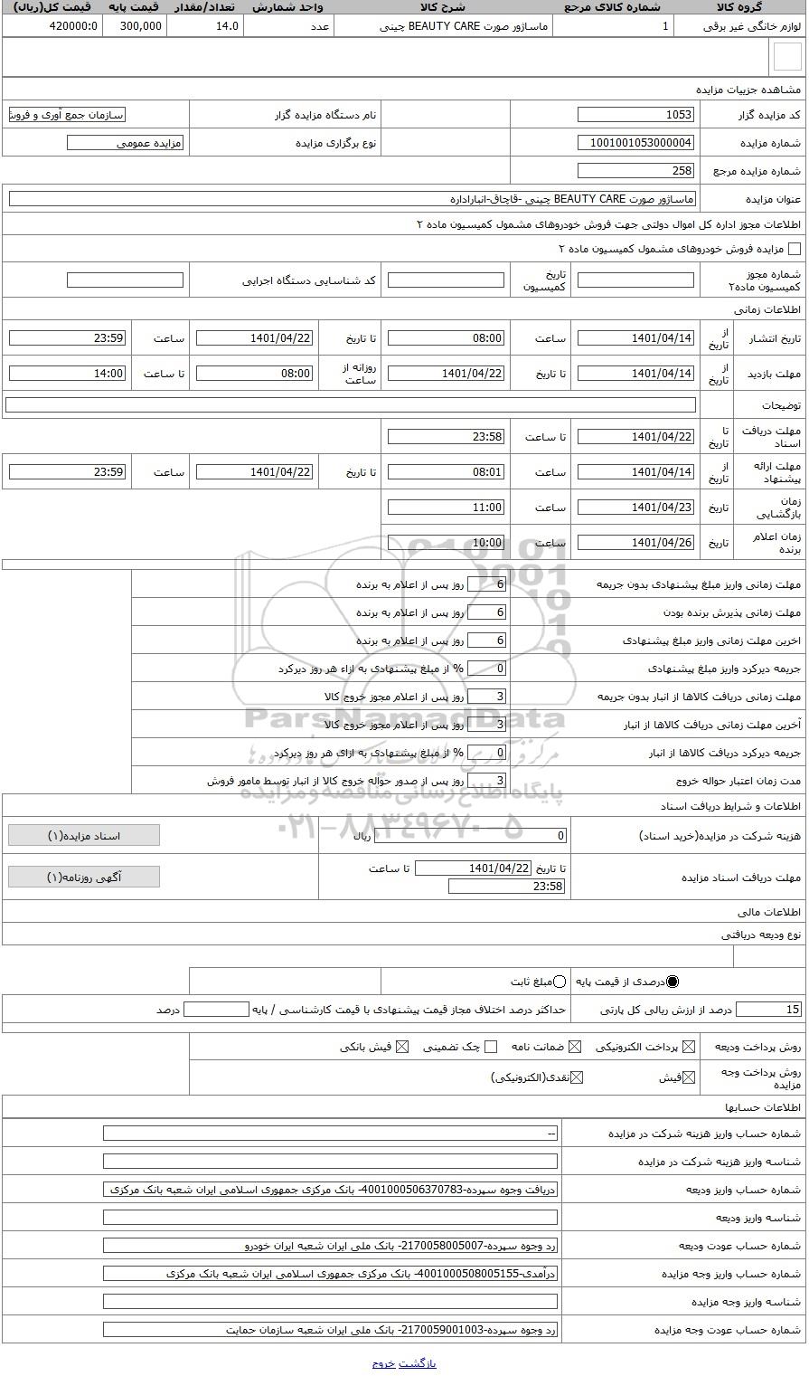 کد مزایده گزار | 1053 | نام دستگاه مزایده گزار | سازمان جمع آوری و فروش اموال تملیکی | |