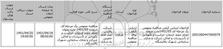 مناقصه، فراخوان ارزیابی کیفی مناقصه عمومی یک مرحله ای 1401/05تحت عنوان انجام حجم خدمات حراست و نگهبانی از تأسیسات و اماکن شرکت و منازل سازمانی شهرک پالایشگاه, مناقصه، فراخوان ارزیابی کیفی مناقصه عمومی یک مرحله ای 1401/05تحت عنوان انجام حجم خدمات حراست و نگهبانی از تأسیسات و اماکن شرکت و منازل سازمانی شهرک پالایشگاه