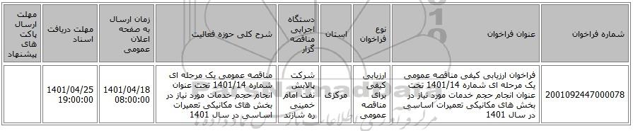 | 2001092447000078 | فراخوان ارزیابی کیفی مناقصه عمومی یک مرحله ای شماره 1401/14 تحت عنوان انجام حجم خدمات مورد نیاز در بخش های مکانیکی تعمیرات اساسی در سال 1401 | ارزیابی کیفی برای مناقصه عمومی | مرکزی | شرکت پالایش نفت امام خمینی ره شازند | مناقصه عمومی یک مرحله ای شماره 1401/14 تحت عنوان انجام حجم خدمات مورد نیاز در بخش های مکانیکی تعمیرات اساسی در سال 1401 | 1401/04/18 08:00:00 | 1401/04/25 19:00:00 |