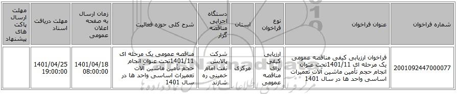 مناقصه، فراخوان ارزیابی کیفی مناقصه عمومی یک مرحله ای 1401/11تحت عنوان انجام حجم تأمین ماشین آلات تعمیرات اساسی واحد ها در سال 1401, مناقصه، فراخوان ارزیابی کیفی مناقصه عمومی یک مرحله ای 1401/11تحت عنوان انجام حجم تأمین ماشین آلات تعمیرات اساسی واحد ها در سال 1401
