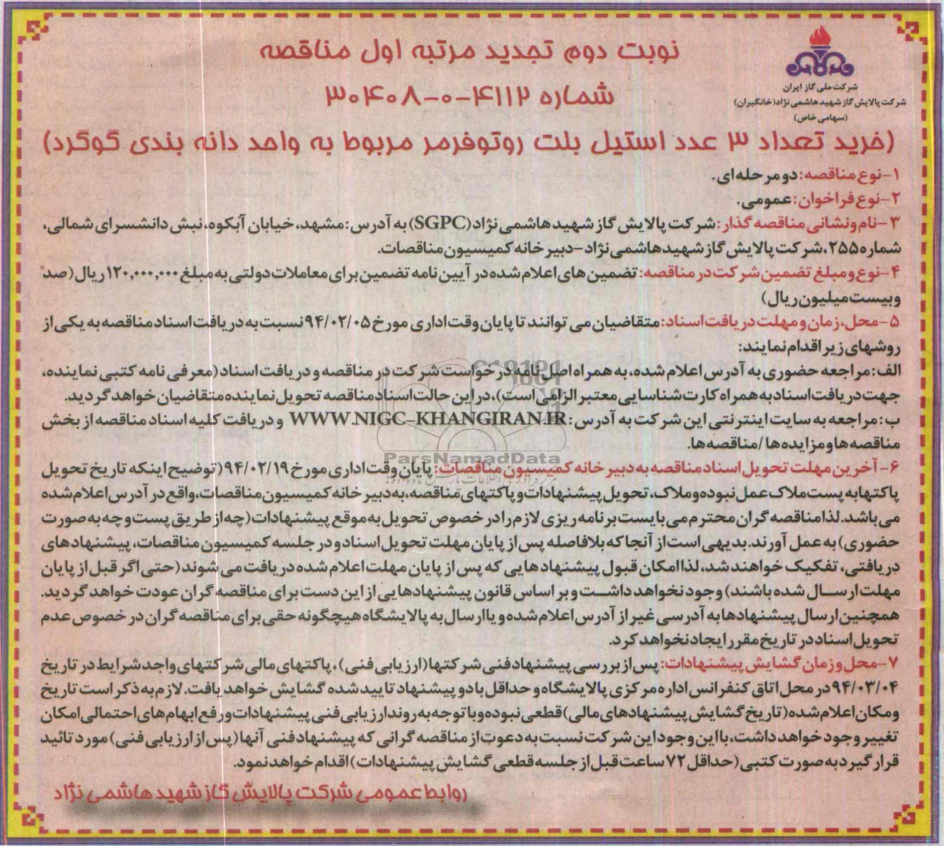 نام ونشانی مناقصه گذار: شرکت پالایش گاز شهید هاشمی نژاد (SGPC) به آدرس: مشهد، خیابان آبکوه، نبش دانشسرای شمالی، شماره 255، شرکت پالایش گاز شهید هاشمی نژاد، دبیرخانه کمیسیون مناقصات
