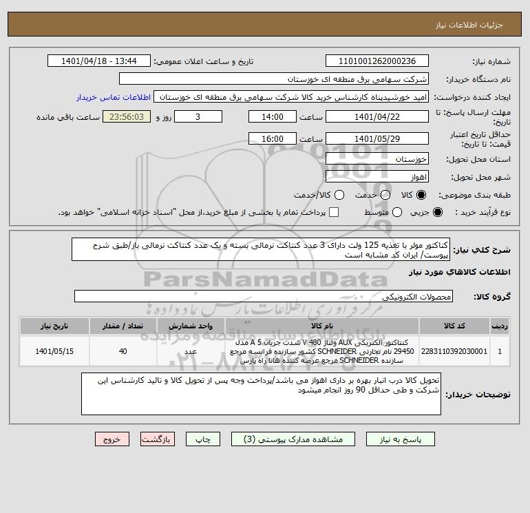 شرح کلی نیاز: کناکتور مولر با تغذیه 125 ولت دارای 3 عدد کنتاکت نرمالی بسته و یک عدد کنتاکت نرمالی باز/طبق شرح پیوست/ ایران کد مشابه است