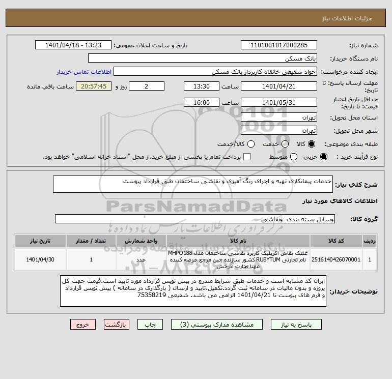 شرح کلی نیاز: خدمات پیمانکاری تهیه و اجرای رنگ آمیزی و نقاشی ساختمان طبق قرارداد پیوست