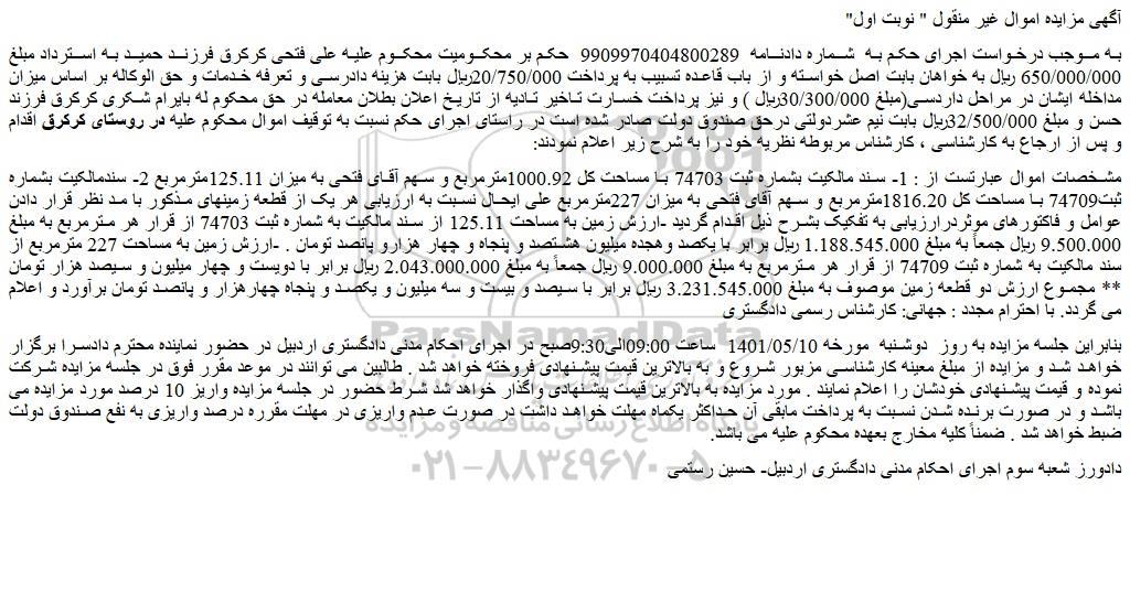 به موجب درخواست اجرای حکم به شماره دادنامه 9909970404800289 حکم بر محکومیت محکوم علیه علی فتحی کرکرق فرزند حمید به استرداد مبلغ 650/000/000 ریال به خواهان بابت اصل خواسته و از باب قاعده تسبیب به پرداخت 20/750/000ریال بابت هزینه دادرسی و تعرفه خدمات و حق الوکاله بر اساس میزان مداخله ایشان در مراحل داردسی(مبلغ 30/300/000ریال ) و نیز پرداخت خسارت تاخیر تادیه از تاریخ اعلان بطلان معامله در حق محکوم له بایرام شکری کرکرق فرزند حسن و مبلغ 32/500/000ریال بابت نیم عشردولتی درحق صندوق دولت صادر شده است در راستای اجرای حکم نسبت به توقیف اموال محکوم علیه در روستای کرکرق اقدام و پس از ارجاع به کارشناسی ، کارشناس مربوطه نظریه خود را به شرح زیر اعلام نمودند: