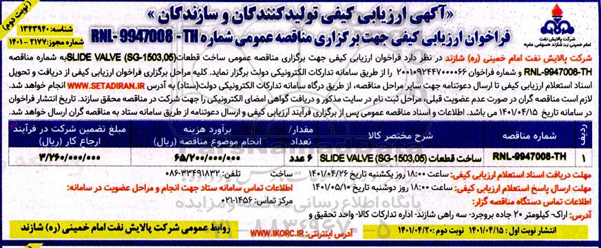 شرکت پالایش نفت امام خمینی (ره) شازند در نظر دارد فراخوان ارزیابی کیفی جهت برگزاری مناقصه عمومی ساخت قطعات SLIDE VALVE SG-1503.05   شماره مناقصه  rnl-9947008-th   را از طریق سامانه تدارکات الکترونیکی دولت برگزار نماید. ضمنا خاطر نشان میسازد کلیه مراحل برگزاری فراخوان ارزیابی کیفی اعم از دریافت و تحویل اسناد استعلام ارزیابی کیفی تا ارسال دعوتنامه و سایر مراحل مناقصه از  طریق درگاه سامانه تدارکات الکترونیکی دولت ستاد انجام خواهد شد ضمنا تاریخ انتشار فراخوان در سامانه ستاد مورخ 1401.4.15 می باشد. اطلاعات و اسناد مناقصه عمومی مورد نظر پس از برگزاری فرایند ارزیابی کیفی از طریق سامانه ستاد به اطلاع مناقصه گران  ارسال خواهد رسید.