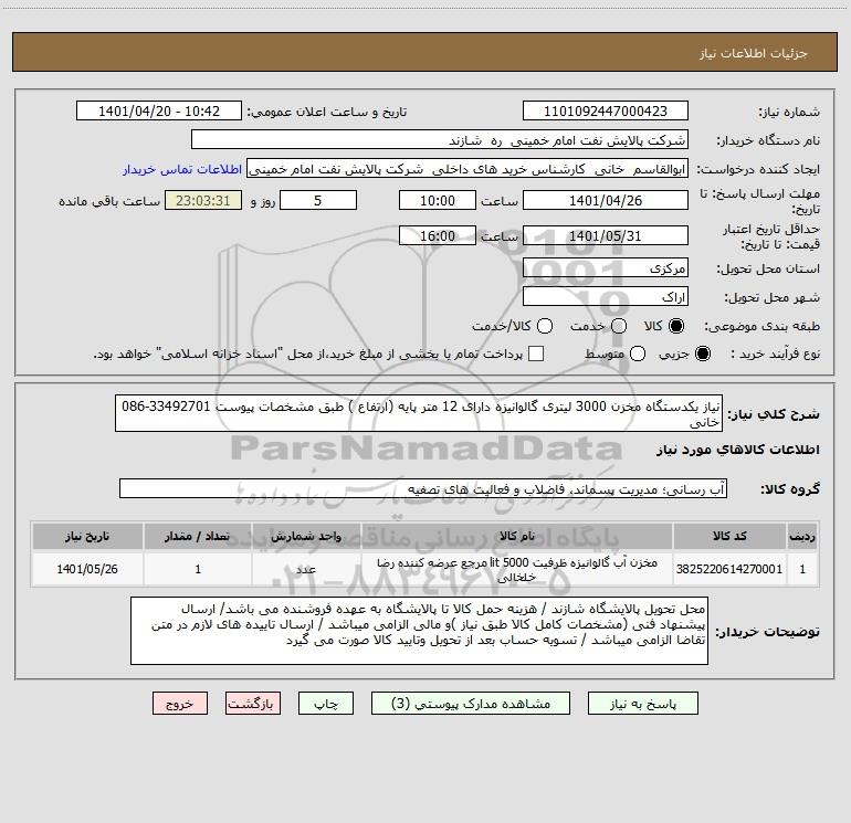 شرح کلی نیاز: نیاز یکدستگاه مخزن 3000 لیتری گالوانیزه دارای 12 متر پایه (ارتفاع ) طبق مشخصات پیوست 33492701-086 خانی