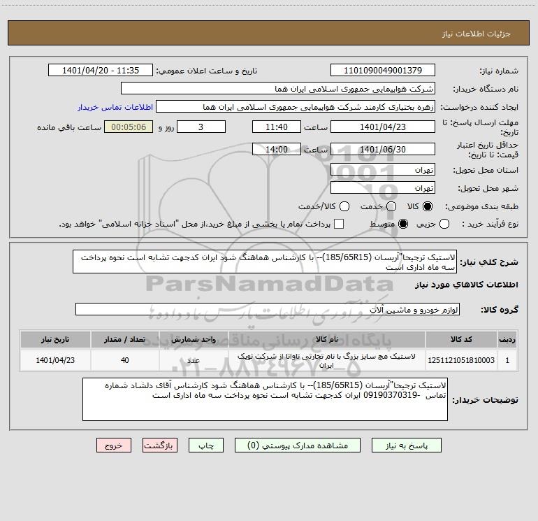 شرح کلی نیاز: لاستیک ترجیحا"آریسان (185/65R15)-- با کارشناس هماهنگ شود ایران کدجهت تشابه است نحوه پرداخت سه ماه اداری است