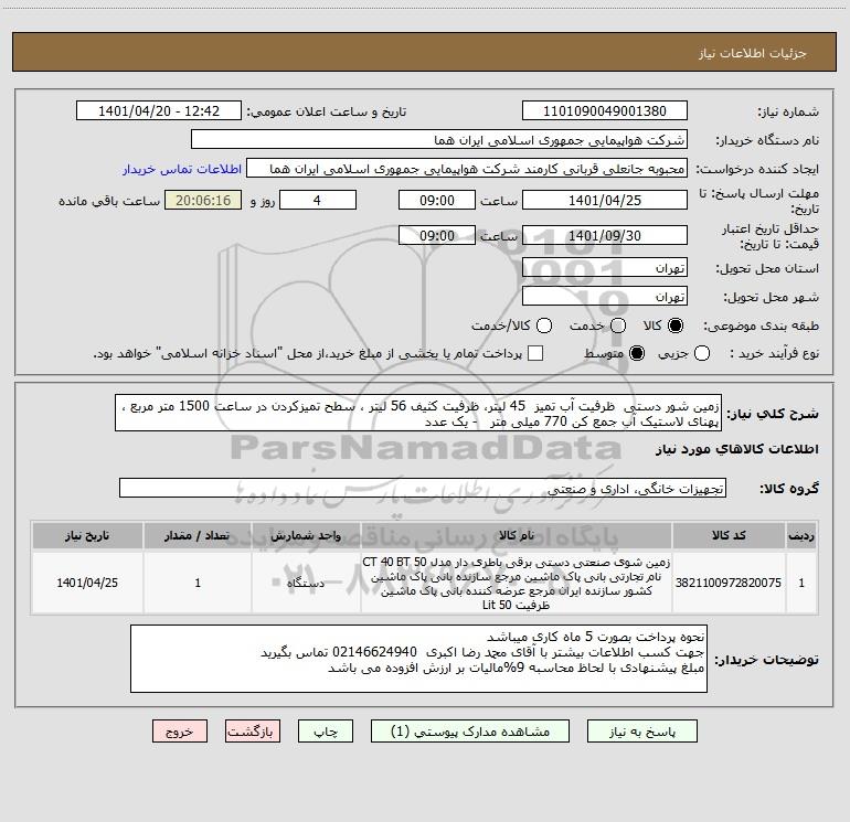 | 1 | 3821100972820075 | زمین شوی صنعتی دستی برقی باطری دار مدل CT 40 BT 50 نام تجارتی بانی پاک ماشین مرجع سازنده بانی پاک ماشین کشور سازنده ایران مرجع عرضه کننده بانی پاک ماشین ظرفیت 50 Lit | دستگاه | 1 | 1401/04/25 |