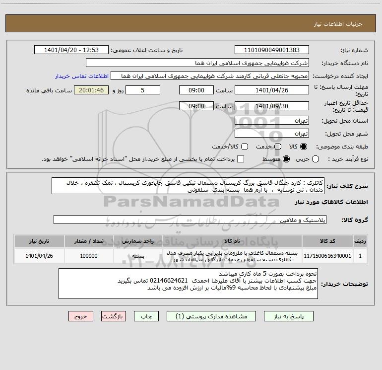 شرح کلی نیاز: کاتلری : کارد چنگال قاشق بزرگ کریستال دستمال نپکین قاشق چایخوری کریستال ، نمک تکنفره ، خلال دندان ، نی نوشابه ، با آرم هما بسته بندی سلفونی