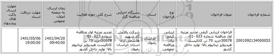 | 2001092134000053 | فراخوان ارزیابی کیفی تجدید مرتبه اول مناقصه شماره 023 -01- 30078خرید 70 تن کاتالیست هیدرولیز تیتانیوم بالا- تولید داخل کشور | ارزیابی کیفی برای مناقصه عمومی | خراسان رضوی | شرکت پالایش گاز شهید هاشمی نژاد استان خراسان رضوی | تجدید مرتبه اول مناقصه شماره 023 -01- 30078خرید 70 تن کاتالیست هیدرولیز تیتانیوم بالا- تولید داخل کشور | 1401/04/20 09:40:00 | 1401/05/06 19:00:00 |