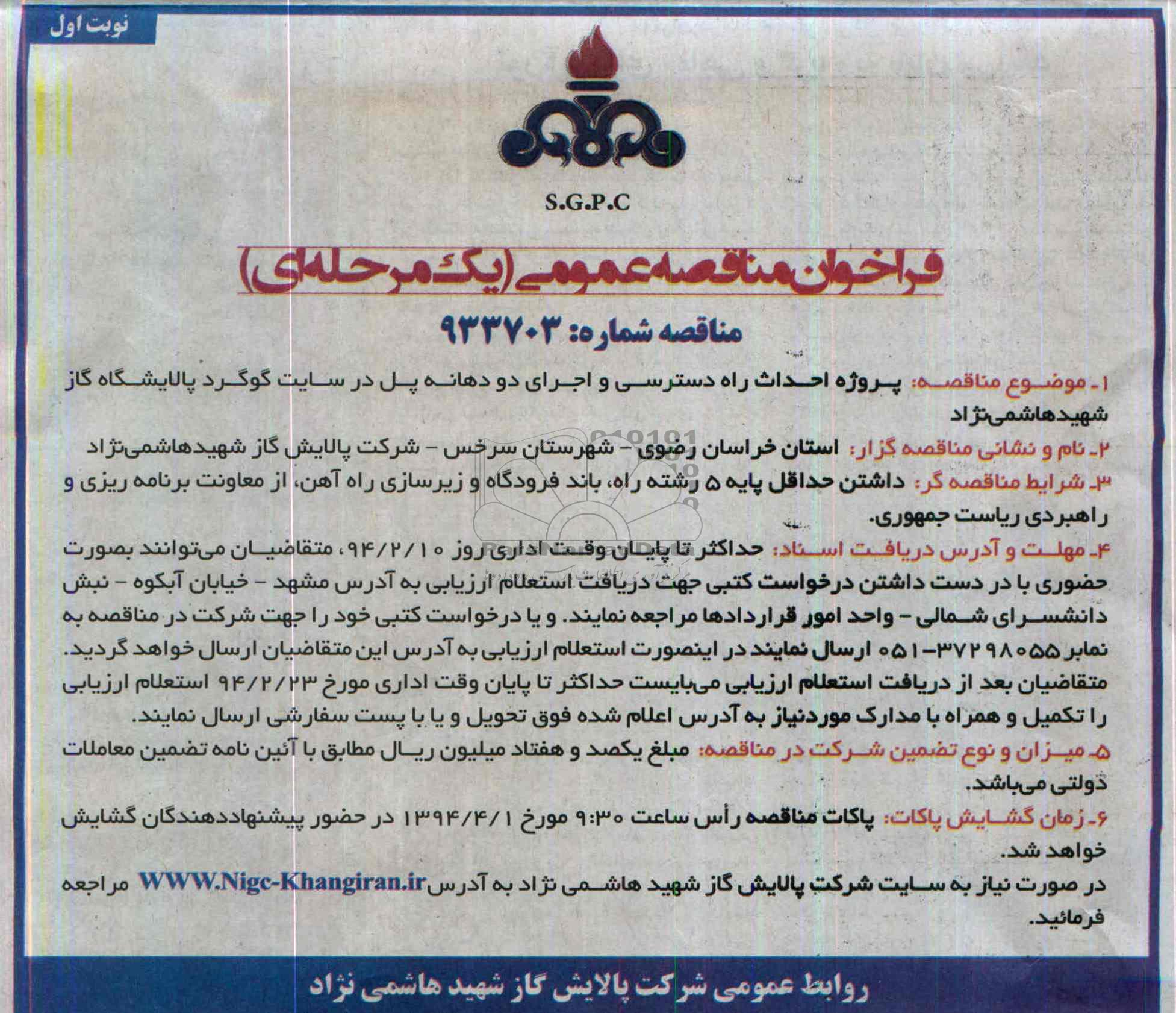 3- نام و نشانی مناقصه گذار: استان خراسان رضوی - شهرستان سرخس -شرکت پالایش گاز شهید هاشمی نژاد