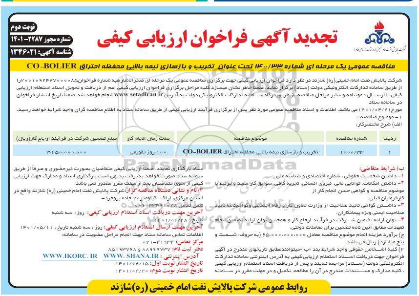 تجدید مناقصه عمومی تخریب و بازسازی نیمه بالایی محفظه احتراق CO - BOLIER نوبت دوم , تجدید مناقصه عمومی تخریب و بازسازی نیمه بالایی محفظه احتراق CO - BOLIER نوبت دوم