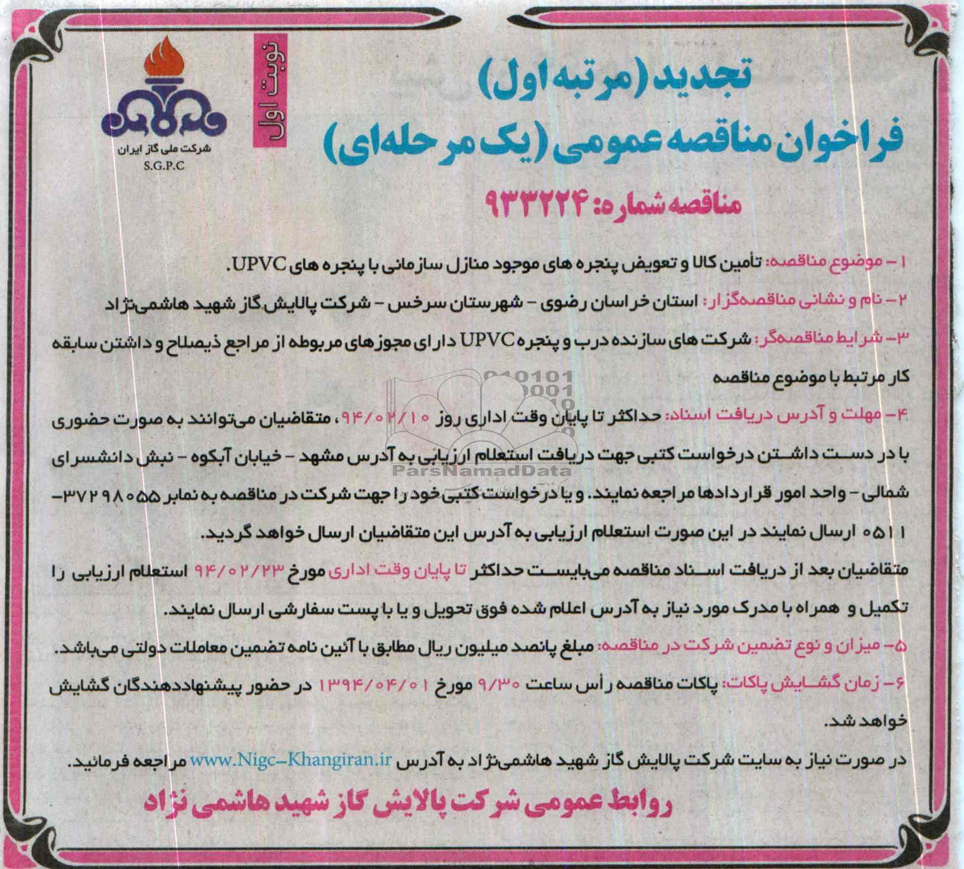 موضوع مناقصه: تامین کالا و تعویض پنجره های موجود منازل سازمانی با پنجره های UPVC