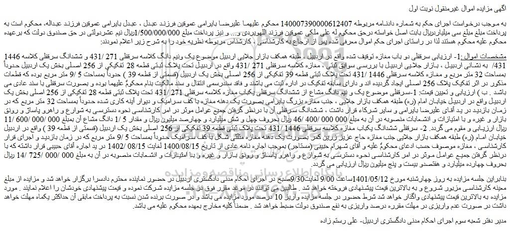 بنابراین جلسه مزایده به روز چهارشنبه مورخ 1401/05/12ساعت 9/00 لغایت9/30صبح در اجرای احکام مدنی دادگستری اردبیل در حضور نماینده محترم دادسرا برگزار خواهد شد و مزایده از مبلغ معینه کارشناسی مزبور شروع و به بالاترین قیمت پیشنهادی فروخته خواهد شد . طالبین می توانند در موعد مقرر فوق در جلسه مزایده شرکت نموده و قیمت پیشنهادی خودشان را اعلام نمایند . مورد مزایده به بالاترین قیمت پیشنهادی واگذار خواهد شد شرط حضور در جلسه مزایده واریز 10 درصد مورد مزایده می باشد و در صورت برنده شدن نسبت به پرداخت مابقی آن حداکثر یکماه مهلت خواهد داشت در صورت عدم واریزی در مهلت مقرره درصد واریزی به نفع صندوق دولت ضبط خواهد شد . ضمناً کلیه مخارج بعهده محکوم علیه می باشد.