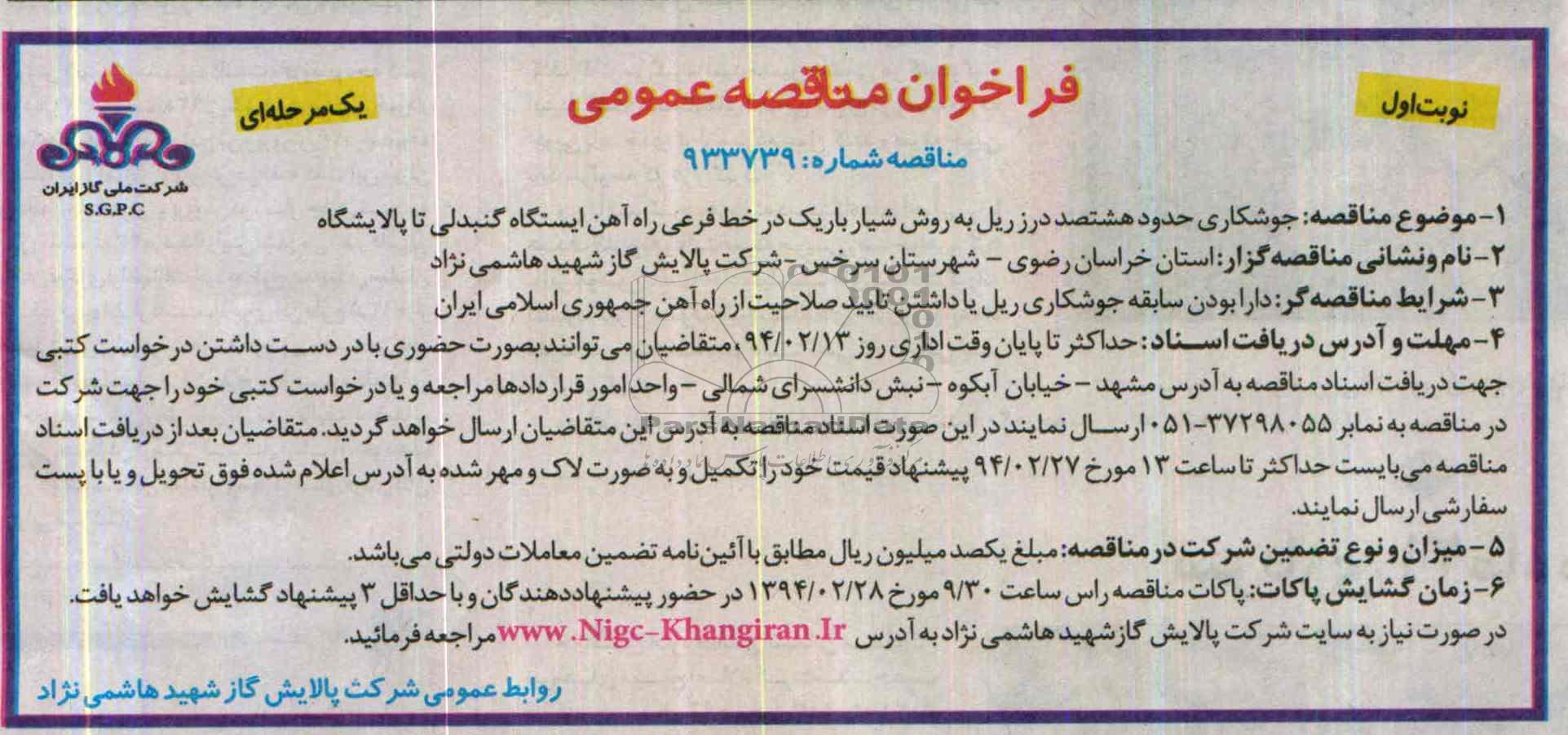 نام و نشانی مناقصه گزار: استان خراسان رضوی- شهرستان سرخس- شرکت پالایش گاز شهید هاشمی نژاد
