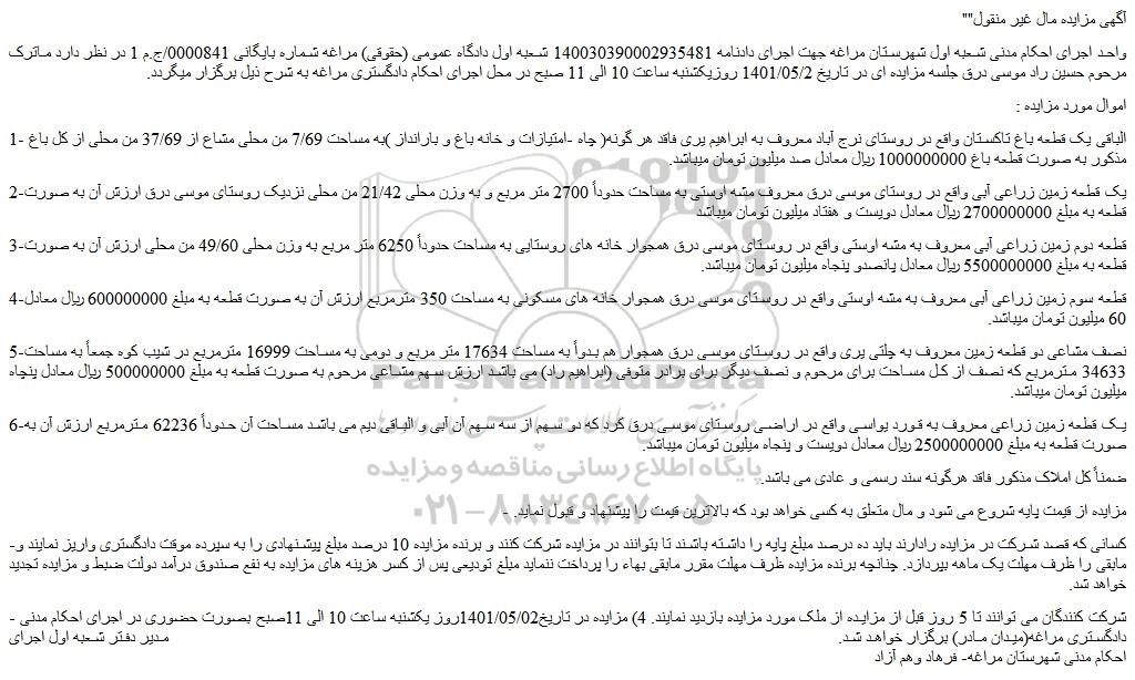 واحد اجرای احکام مدنی شعبه اول شهرستان مراغه جهت اجرای دادنامه 140030390002935481 شعبه اول دادگاه عمومی (حقوقی) مراغه شماره بایگانی 0000841/ج.م 1 در نظر دارد ماترک مرحوم حسین راد موسی درق جلسه مزایده ای در تاریخ 1401/05/2 روزیکشنبه ساعت 10 الی 11 صبح در محل اجرای احکام دادگستری مراغه به شرح ذیل برگزار میگردد.