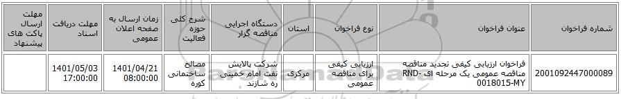 مناقصه، فراخوان ارزیابی کیفی تجدید مناقصه مناقصه عمومی یک مرحله ای RND-0018015-MY, مناقصه، فراخوان ارزیابی کیفی تجدید مناقصه مناقصه عمومی یک مرحله ای RND-0018015-MY