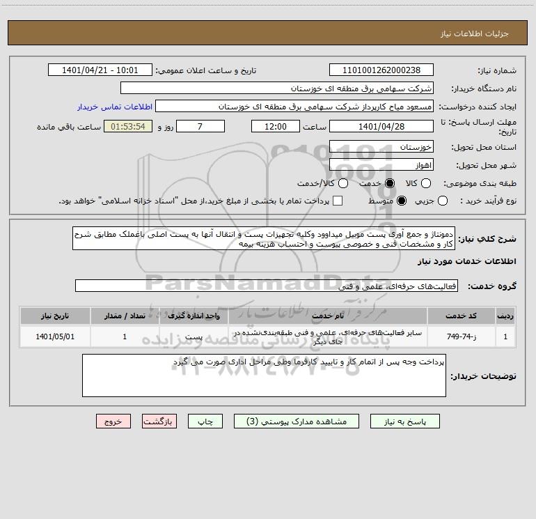 شرح کلی نیاز: دمونتاژ و جمع آوری پست موبیل میداوود وکلیه تجهیزات پست و انتقال آنها به پست اصلی باغملک مطابق شرح کار و مشخصات فنی و خصوصی پیوست و احتساب هزینه بیمه