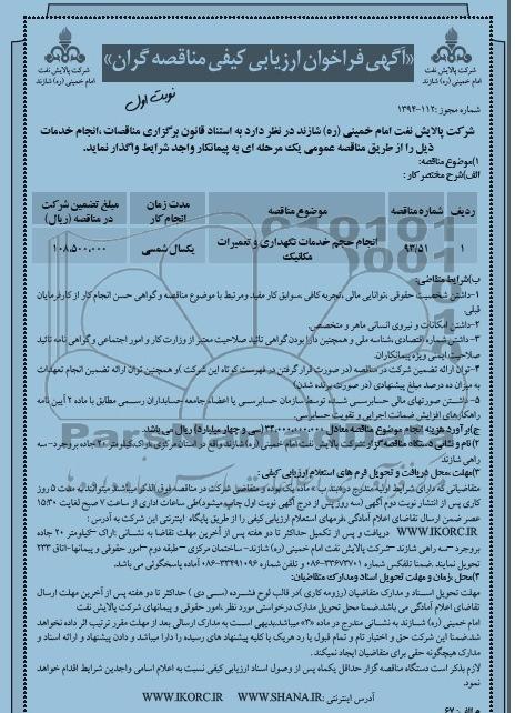 شرکت پالایش نفت امام خمینی ره شازند در نظر دارد به استناد قانون برگزاری مناقصات، انجام خدمات ذیل را از طریق برگزاری مناقصه عمومی یک مرحله ای یبه پیمانکار واجد شرایط واگذار نماید.
