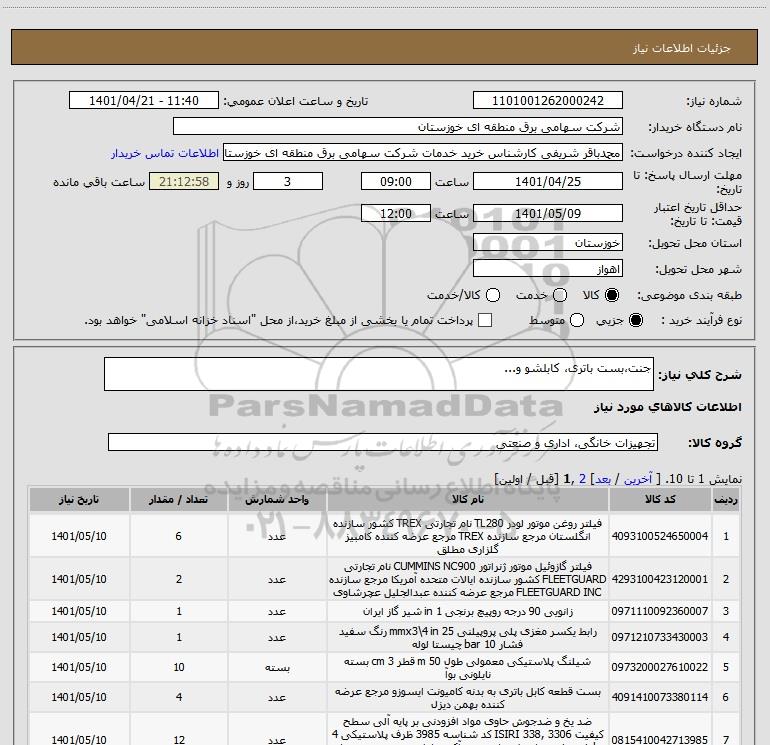 استعلام جنت،بست باتری، کابلشو و..., استعلام جنت،بست باتری، کابلشو و...