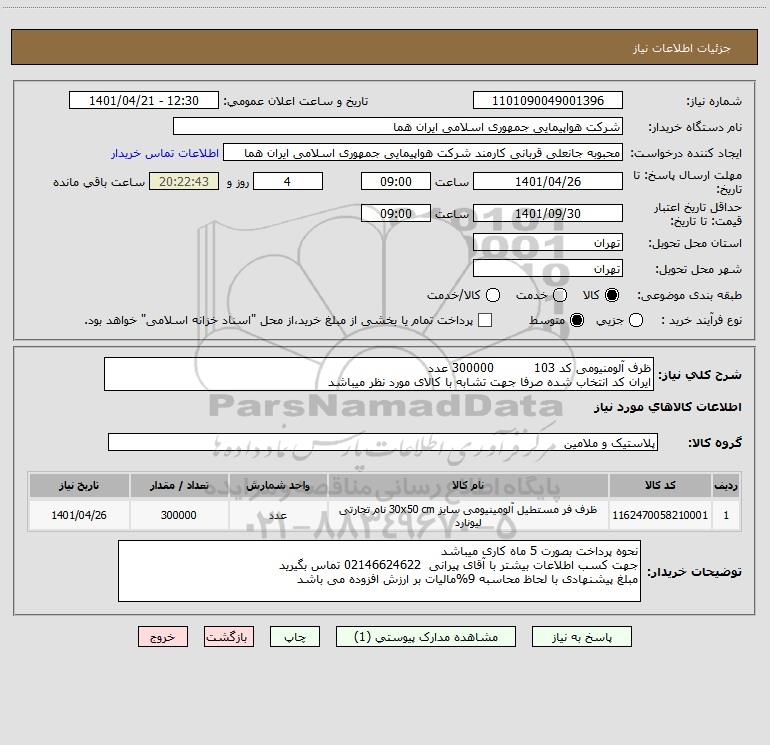 شرح کلی نیاز: ظرف آلومنیومی کد 103 300000 عدد