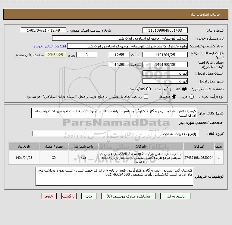 شرح کلی نیاز: کپسول آتش نشانی پودر و گاز 2 کیلوگرمی همرا با پایه -ا یران کد جهت تشابه است نحو ه پرداخت پنج ماه اداری است
