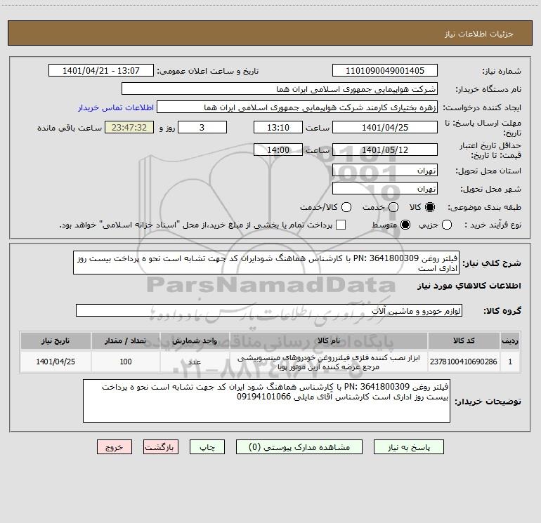 شرح کلی نیاز: فیلتر روغن PN: 3641800309 با کارشناس هماهنگ شودایران کد جهت تشابه است نحو ه پرداخت بیست روز اداری است