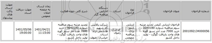 | 2001092134000056 | فراخوان ارزیابی کیفی تجدید مرتبه سوم مناقصه شماره 0040180 - خرید 7000 عدد آجر نسوز کوره های واحد بازیافت گوگرد - تولید داخل کشور | ارزیابی کیفی برای مناقصه عمومی | خراسان رضوی | شرکت پالایش گاز شهید هاشمی نژاد استان خراسان رضوی | تجدید مرتبه سوم مناقصه شماره 0040180 - خرید 7000 عدد آجر نسوز کوره های واحد بازیافت گوگرد - تولید داخل کشور | 1401/04/21 11:15:00 | 1401/05/06 19:00:00 |