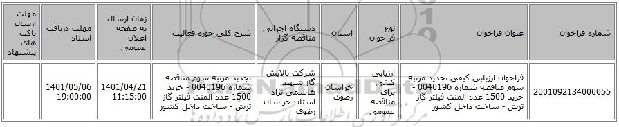 مناقصه، فراخوان ارزیابی کیفی تجدید مرتبه سوم مناقصه شماره 0040196 - خرید 1500 عدد المنت فیلتر گاز ترش - ساخت داخل کشور از کلیه افراد متخصص و شرکتها واجد شرایط دعوت به عمل میآید در مناقصه با کد خبرگزاری پارس نماد: 4715745 شرکت نمایند.