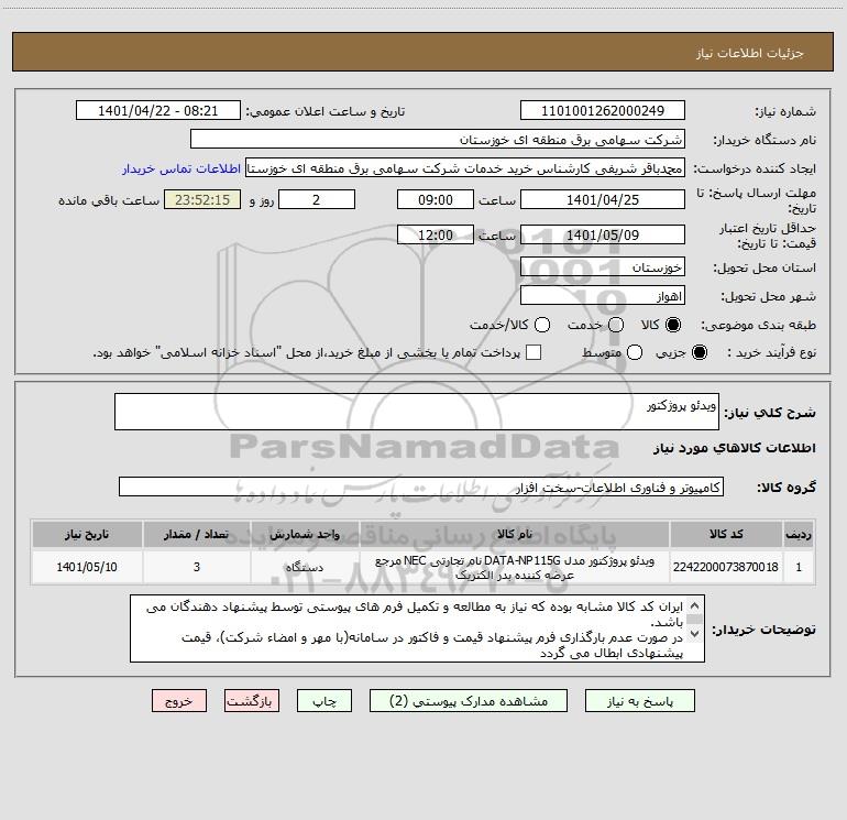 شرح کلی نیاز: ویدئو پروژکتور