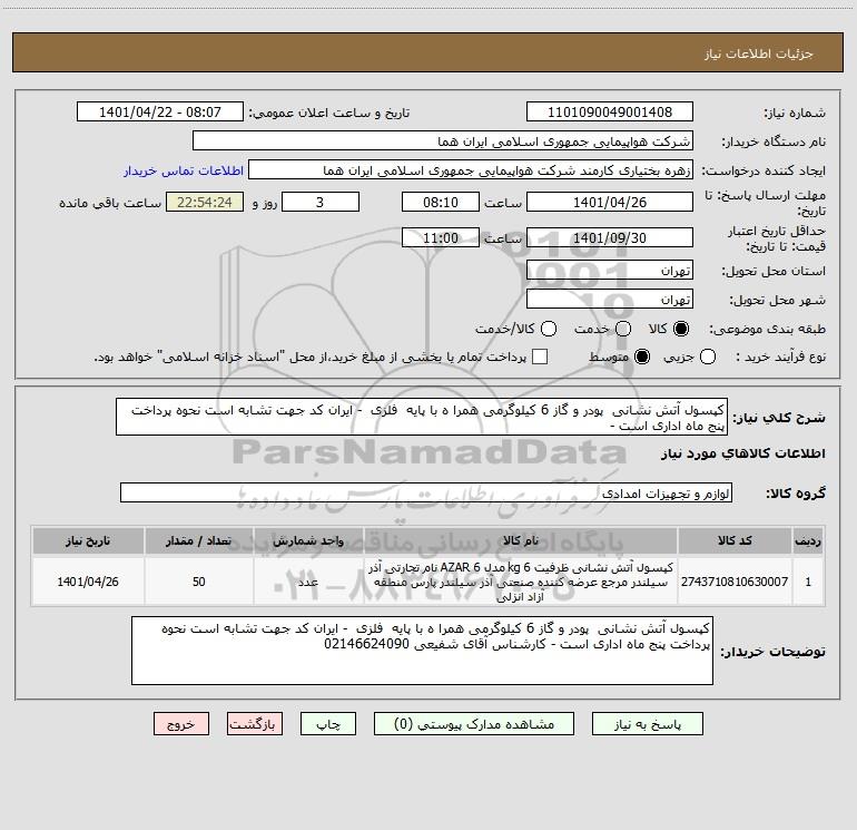 شرح کلی نیاز: کپسول آتش نشانی پودر و گاز 6 کیلوگرمی همرا ه با پایه فلزی - ایران کد جهت تشابه است نحوه پرداخت پنج ماه اداری است -
