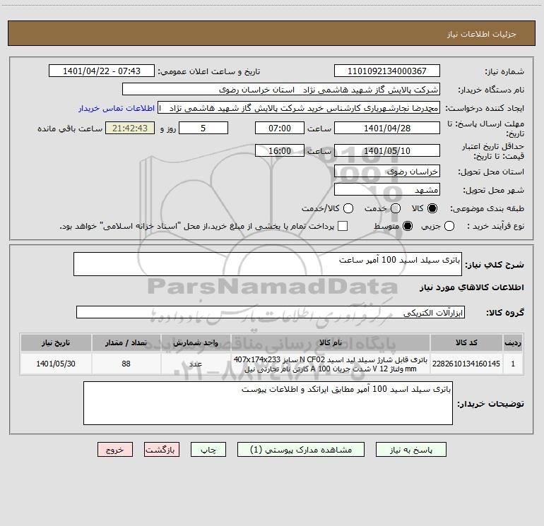 نام دستگاه خریدار:شرکت پالایش گاز شهید هاشمی نژاد استان خراسان رضوی