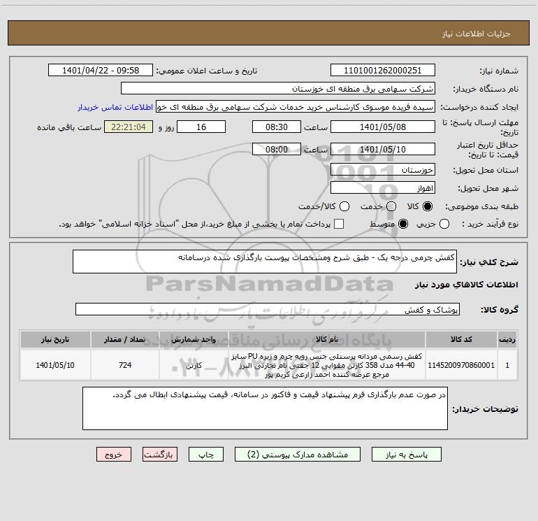 شرح کلی نیاز: کفش چرمی درجه یک - طبق شرح ومشخصات پیوست بارگذاری شده درسامانه
