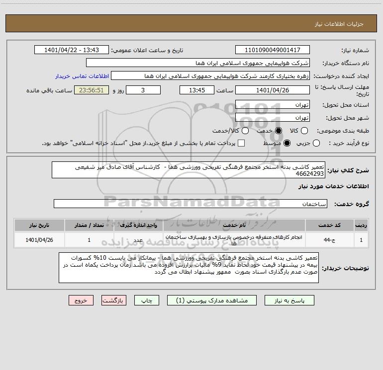 شرح کلی نیاز: تعمیر کاشی بدنه استخر مجتمع فرهنگی تفریحی وورزشی هما - کارشناس آقای صادق میر شفیعی 46624293