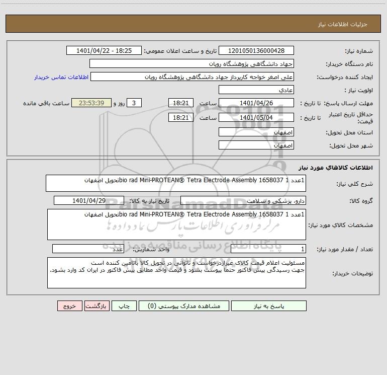 مشخصات کالای مورد نیاز: 1عدد 1 1658037 bio rad Mini-PROTEAN® Tetra Electrode Assemblyتحویل اصفهان
