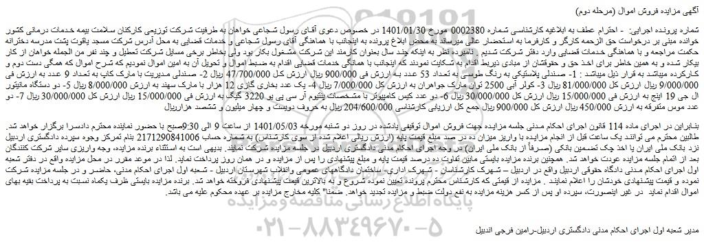 آگهی مزایده فروش اموال (مرحله دوم)