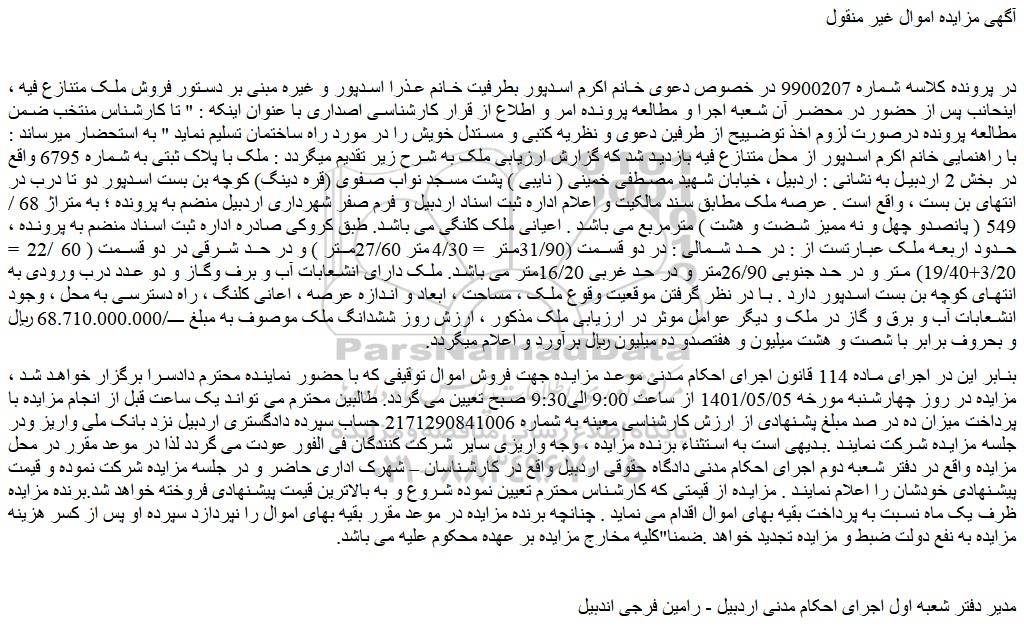 در پرونده کلاسه شماره 9900207 در خصوص دعوی خانم اکرم اسدپور بطرفیت خانم عذرا اسدپور و غیره مبنی بر دستور فروش ملک متنازع فیه ، اینحانب پس از حضور در محضر آن شعبه اجرا و مطالعه پرونده امر و اطلاع از قرار کارشناسی اصداری با عنوان اینکه : " تا کارشناس منتخب ضمن مطالعه پرونده درصورت لزوم اخذ توضییح از طرفین دعوی و نظریه کتبی و مستدل خویش را در مورد راه ساختمان تسلیم نماید " به استحضار میرساند : با راهنمایی خانم اکرم اسدپور از محل متنازع فیه بازدید شد که گزارش ارزیابی ملک به شرح زیر تقدیم میگردد : ملک با پلاک ثبتی به شماره 6795 واقع در بخش 2 اردبیل به نشانی : اردبیل ، خیابان شهید مصطفی خمینی ( نایبی ) پشت مسجد نواب صفوی (قره دینگ) کوچه بن بست اسدپور دو تا درب در انتهای بن بست ، واقع است . عرصه ملک مطابق سند مالکیت و اعلام اداره ثبت اسناد اردبیل و فرم صفر شهرداری اردبیل منضم به پرونده ؛ به متراژ 68 / 549 ( پانصدو چهل و نه ممیز شضت و هشت ) مترمربع می باشد . اعیانی ملک کلنگی می باشد. طبق کروکی صادره اداره ثبت اسناد منضم به پرونده ، حدود اربعه ملک عبارتست از : در حد شمالی : در دو قسمت (31/90متر = 4/30متر 27/60متر ) و در حد شرقی در دو قسمت ( 60 /22 = 3/20+19/40) متر و در حد جنوبی 26/90متر و در حد غربی 16/20متر می باشد. ملک دارای انشعابات آب و برف وگاز و دو عدد درب ورودی به انتهای کوچه بن بست اسدپور دارد . با در نظر گرفتن موقعیت وقوع ملک ، مساحت ، ابعاد و اندازه عرصه ، اعانی کلنگ ، راه دسترسی به محل ، وجود انشعابات آب و برق و گاز در ملک و دیگر عوامل موثر در ارزیابی ملک مذکور ، ارزش روز ششدانگ ملک موصوف به مبلغ ــــ/68.710.000.000 ریال و بحروف برابر با شصت و هشت میلیون و هفتصدو ده میلیون ریال برآورد و اعلام میگردد.