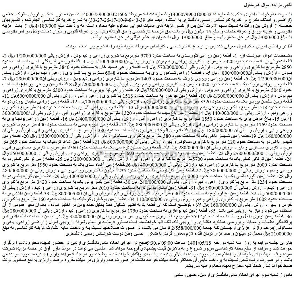 مشخصات اموال عبارتست از: 1- قطعه زمین زراعی کلورسدی به مساحت حدود 5700 مترمربع با کاربری زراعی و دیم بودن ، ارزش ریالی 1/200/000/000 ریال 2- قطعه دعوالی یر به مساحت حدود 5320 مترمربع با کاربری زراعی و دیم بودن ، ارزش ریالی آن1/100/000/000 ریال 3- قطعه زراعی شریکلی با نبی به مساحت حدود 2850 مترمربع با کاربری زراعی و دیم بودن ، ارزش ریالی آن570/000/000 ریال 4-- قطعه زراعی صمید خان به مساحت حدود 3840 مترمربع با کاربری زراعی و دیم بودن ، ارزش ریالی آن800/000/000 ریال 5- - قطعه زراعی شاهورن یری به مساحت حدود 6048 مترمربع با کاربری زراعی و دیم بودن ، ارزش ریالی آن1/200/000/000 ریال 6- قطعه زمین زراعی روبروی بزرک به مساحت حدود 1405 مترمربع با کاربری زراعی و دیم بودن ، ارزش ریالی آن290/000/000 ریال 7- قطعه زمین زراعی بزرک یک به مساحت حدود 6020 مترمربع با کاربری زراعی و دیم بودن ، ارزش ریال1/200/000/000ریال 8-قطعه زمین زراعی بوز داغ به مساحت حدود 5040 مترمربع با کاربری زراعی و دیم بودن ، ارزش ریالی آن 750/000/000ریال 9- قطعه زراعی تپه بویونی به مساحت حدود 6300 مترمربع با کاربری زراعی و دیم بودن ، ارزش ریالی آن 1/300/000/000ریال 10- قطعه زمین چوخور به مساحت حدود 1518 با کاربری زراعی و آبی ، ارزش ریالی آن 600/0000/000ریال 11- قطعه زمین سلیمان یوردی یک به مساحت حدود 3520 متر مربع با کاربری زراعی ودیم ، ارزش ریالی آن 700/000/000ریال 12- قطعه زمین زراعی سلیمان یوردی دو به مساحت حدود 1518متر مربع با کاربری زراعی ودیم ، ارزش ریالی آن 330/000/000ریال 13 – قطعه زمین زراعی گل یری به مساحت حدود 468 متر مربع با کاربری زراعی ودیم ، ارزش ریالی آن 140/000/000 ریال 14-قطعه زمین باغ سیب به مساحت حدود 1320 متر مربع با کاربری زراعی و آبی ، ارزش ریالی آن /300/000/000 /1ریال 15- باغ عوض یری به مساحت حدود 1550 متر مربع با کاربری زراعی و آبی ، ارزش ریالی آن 1/400/000/000ریال 16- قطعه زمین زراعی یونجا یری به مساحت حدود 1769 متر مربع با کاربری زراعی و آبی ، ارزش ریالی آن 880/000/000 ریال 17- قطعه زمین شورم چمنی به مساحت حدود 400 متر مربع با کاربری زراعی و آبی ، ارزش ریالی آن 180/000/000 ریال 18- قطعه زمین الوچه باغی یری به مساحت حدود 380 متر مربع با کاربری زراعی و آبی ، ارزش ریالی آن 160/000/000 ریال 19-قطعه زمین شهمار باغی یک به مساحت حدود 380 متر مربع با کاربری مسکونی و بایر ، ارزش ریالی آن 1/300/000/000 ریال 20- قطعه زمین شهمار باغی دو به مساحت حدود 120 متر مربع با کاربری مسکونی و بایر ، ارزش ریالی آن 300/000/000ریال 21- قطعه زمین اشاغا کرملیک به مساحت حدود 265 متر مربع با کاربری مسکونی و بایر ، ارزش ریالی آن 280/000/000 ریال 22- قطعه زمین حسین دره سی یک به مساحت حدود 2560 متر مربع با کاربری مسکونی و آبی ، ارزش ریالی آن 2/600/000/000 ریال 23- قطعه زمین حسین دره سی دو به مساحت حدود 693 متر مربع با کاربری زراعی ودیم ، ارزش ریالی آن 550/000/000 ریال 24- قطعه زمین تو لکی کانی یک به مساحت حدود 5700متر مربع با کاربری زراعی و آبی ، ارزش ریالی آن 2/200/000/000ریال 25- قطعه زمین تو لکی کانی دو به مساحت حدود 2000 متر مربع با کاربری زراعی ودیم ، ارزش ریالی آن 400/000/000 ریال 26-قطعه زمین آغمام سدی یک به مساحت حدود 1950 متر مربع با کاربری زراعی و دیم ، ارزش ریالی آن 380/000/000 ریال 27-قطعه زمین کان اوستی به مساحت حدود 1235 میلیون با کاربری زراعی و آبی ، ارزش ریالی آن 480/000/000 ریال 28- قطعه زمین گوزه باشی یک به مساحت حدود 2000 متر مربع با کاربری زراعی و دیم ، ارزش ریالی آن 400/000/000 ریال 29- قطعه زمین گوزه باشی دو به مساحت حدود 1234 متر مربع با کاربری زراعی و دیم ، ارزش ریالی آن 240/000/000 ریال 30- قطعه زمین بنمار یولی یک به مساحت حدود 3420 متر مربع با کاربری زراعی و دیم ، ارزش ریالی آن 900/000/000 ریال 31- قطعه زمین بنمار یولی دو به مساحت حدود 2010 متر مربع با کاربری زراعی و دیم ، ارزش ریالی آن 500/000/000 ریال 32- قطعه زمین آغ قوم لوخ به مساحت حدود 640 متر مربع با کاربری زراعی و دیم ، ارزش ریالی آن 80/000/000 ریال 33-قطعه زمین داشدی یر به مساحت حدود 1008 متر مربع با کاربری زراعی و دیم ، ارزش ریالی آن 110/000/000 34- قطعه زمین یوخ