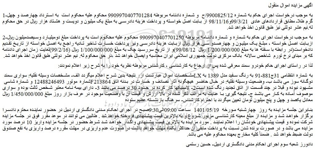 شعبه صادر کننده:شعبه سوم اجرای احکام مدنی دادگستری شهرستان اردبیل