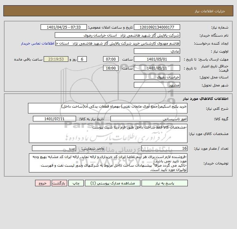 نام دستگاه خریدار:شرکت پالایش گاز شهید هاشمی نژاد استان خراسان رضوی