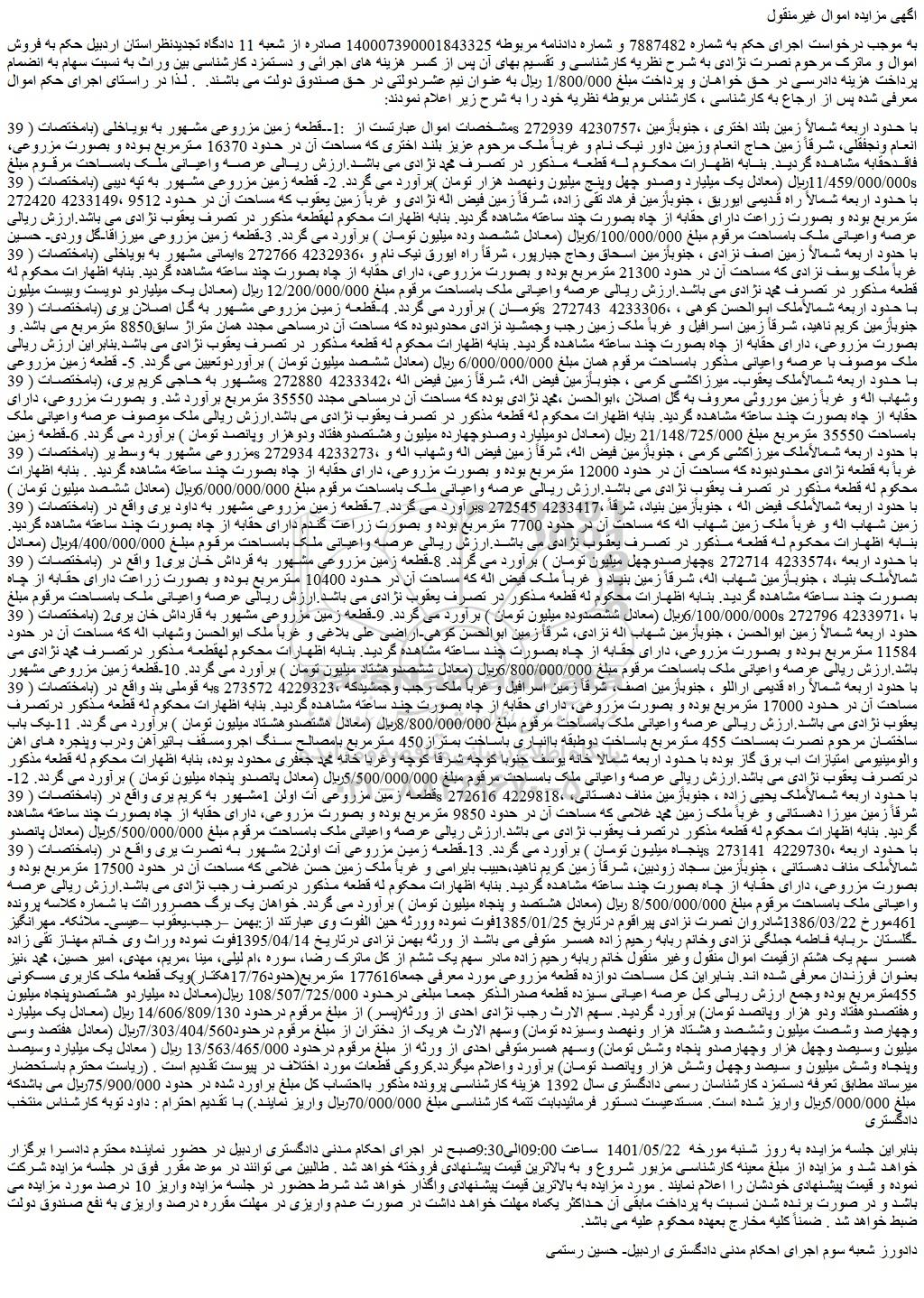 بنابراین جلسه مزایده به روز شنبه مورخه 1401/05/22 ساعت 09:00الی9:30صبح در اجرای احکام مدنی دادگستری اردبیل در حضور نماینده محترم دادسرا برگزار خواهد شد و مزایده از مبلغ معینه کارشناسی مزبور شروع و به بالاترین قیمت پیشنهادی فروخته خواهد شد . طالبین می توانند در موعد مقرر فوق در جلسه مزایده شرکت نموده و قیمت پیشنهادی خودشان را اعلام نمایند . مورد مزایده به بالاترین قیمت پیشنهادی واگذار خواهد شد شرط حضور در جلسه مزایده واریز 10 درصد مورد مزایده می باشد و در صورت برنده شدن نسبت به پرداخت مابقی آن حداکثر یکماه مهلت خواهد داشت در صورت عدم واریزی در مهلت مقرره درصد واریزی به نفع صندوق دولت ضبط خواهد شد . ضمناً کلیه مخارج بعهده محکوم علیه می باشد.