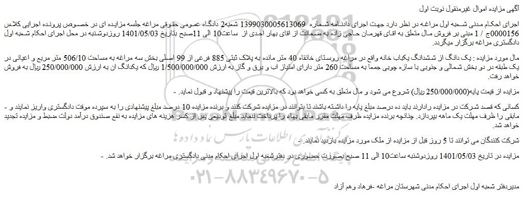 - مزایده در تاریخ 1401/05/03 روزدوشنبه ساعت10 الی 11 صبح بصورت حضوری در دفترشعبه اول اجرای احکام مدنی دادگستری مراغه برگزار خواهد شد.