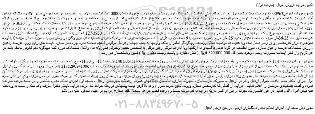 شماره پرونده اجرایی0000963: ریا ست محترم شعبه اول اجرای احکام مدنی دادگستری شهرستان اردبیل سلام علیکم موضوع پرونده 0000963 احتراما حسب الامر در خصوص پرونده اجرائی صدر الاشاره متشکله فیمابین آقای شهروز- شاهنده حور و وآقای علیرضا- کریمی هومونلو، مطروحه در آن شعبه محترم ، اینجانب ضمن اطلاع از قرار کارشناسی اصداری مبنی بر: مطالعه پرونده-در صورت لزوم اخذ توضیح از طرفین دعوی و ارائه ئظریه کتبی ومستدل در مورد ملک توقیف شده در قبال محکوم به ، در مورخ 1401/03/21 در معیت وبا راهنمائی هر دو طرف از محل ملک تعرفه شده بشرح عرصه واعیان یکباب مغازه تحت پلاک ثبتی : 3930 فرعی از 127- اصلی بخش سه اردبیل به نشانی : اردبیل – فلکه علی سرباز-محله احمدیه- تقاطع کوچه رنجبر 6 بازدید وبعد از معاینه محلی و ملاحظه مدارک ابرازی و استماع اظهارات هر دو طرف و بر رسی های لازم وبالاخره مداقه نظر در جوانب موضوع اینک نتیجه بشرح زیر باستحضار می رسد : ملک مورد نظر عبارتست از عرصه واعیان یکباب مغازه تحت پلاک ثبتی 127/3930 اصلی با ساختمان یک طبقه از نوع اسکلت فلزی ، مساحت عرصه طبق سند 36/25متر مربع ، مساحت اعیانی حدود 25 متر مربع بصورت مغازه با 6 دهنه کرکره فلزی ، کف سرامیک- دیوار ها سرامیک دارای انشعابات آب برق وگاز در زمان بازدید بصورت خالی میباشد0 با توجه بموضوع قرار کارشناسی و بر رسی بعمل آمده وبا عنایت به موقعیت محلی ووسعت وچگونگی استقرار ملک وتوجها به جمیع جهات وعوامل موثردر قضیه منجمله نحوه بهره دهی مغازه ،قیمت های رایج روز، عرصه واعیان ،ارزش ششدانک عرصه واعیان مغازه ، بدون احتساب هر گونه بدهی یا تعهدی به ارگانها ویا ادارات دولتی وغیر دولتی یا اشخاص حقیقی وحقوقی بطوریکه نقل وانتقال ششدانک مورد ثبت هیچگونه منع قانونی نداشته باشد در این تاریخ واز نظر اینجانب بصورت وضع موجود بمبلغ کل 6.520.000.000ریال ( شش میلیارد و پانصد وبیست میلیون ریال) تعیین وباستحضار می رسد.
