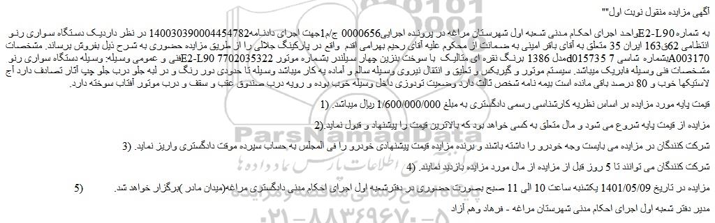 واحد اجرای احکام مدنی شعبه اول شهرستان مراغه در پرونده اجرایی0000656 ج/م1جهت اجرای دادنامه140030390004454782 در نظر داردیک دستگاه سواری رنو E2-L90 به شماره انتظامی 62ق163 ایران 35 متعلق به آقای باقر امینی به ضمانت از محکوم علیه آقای رحیم بهرامی اقدم واقع در پارکینگ جلالی را از طریق مزایده حضوری به شرح ذیل بفروش برساند. مشخصات فنی و عمومی وسیله: وسیله دستگاه سواری رنو E2-L90 مدل 1386 برنگ نقره ای متالیک با سوخت بنزین چهار سیلندر بشماره موتور 7702035322d015735 بشماره شاسی 7A003170 مشخصات فنی وسیله فابریک میباشد. سیستم موتور و گیربکس و تعلیق و انتقال نیروی وسیله سالم و آماده یه کار میباشد وسیله تا حدودی دور رنگ و در لبه جلو درب جلو چپ آثار تصادف دارد آج لاستیکها خوب و 80 درصد باقی مانده است بیمه نامه شخص ثالث دارد وضعیت تودوزی داخل وسیله خوب بوده و رویه درب صندوق عقب و سقف و درب موتور آفتاب سوخته دارد.