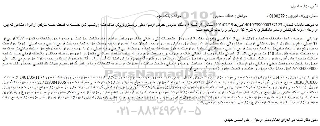شماره پرونده اجرایی : 0100279 ، خواهان : عدالت صدیقی خوانده: بانک سپه